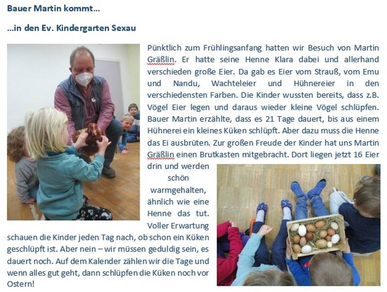 Entsprechend unserem Leitsatz Nr. 1 und dem evangelischen Profil der evangelischen Landeskirche in Baden, hat auch der evangelische Kindergarten in Sexau seine Arbeit konkretisiert und ausgerichtet. Zusätzlich haben wir auch in unseren Erziehungszielen auf die christliche Grundhaltung Bezug genommen.