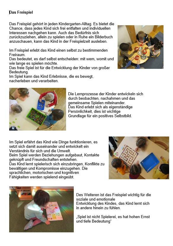 Ein wesentlicher Bestandteil unserer pädagogischen Arbeit stellt das Spiel der Kinder in der Freispielzeit dar. Den nötigen (Zeit)Raum geben wir den Kindern in unserem Alltag; denn das selbstinszenierte Spiel mit den Freunden oder auch alleine, bietet den Kindern ein sehr großes Lern- und Entwicklungsspektrum.
