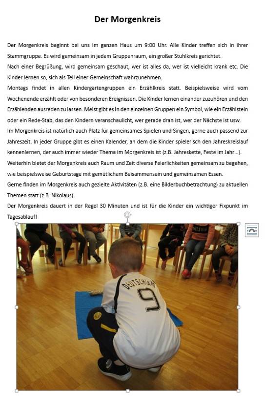 Abgesehen von den Freispielzeiten bestehen im Kindergarten feste Orientierungspunkte (z.B. Morgenkreis) im Tagesablauf, welche den Kindern Sicherheit und Struktur bieten sollen.